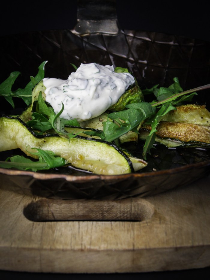 Roasted Zucchini with Dandelion and Wild Herbs Cream Cheese after a Brandenburg Bicycle Tour